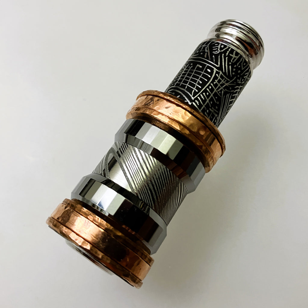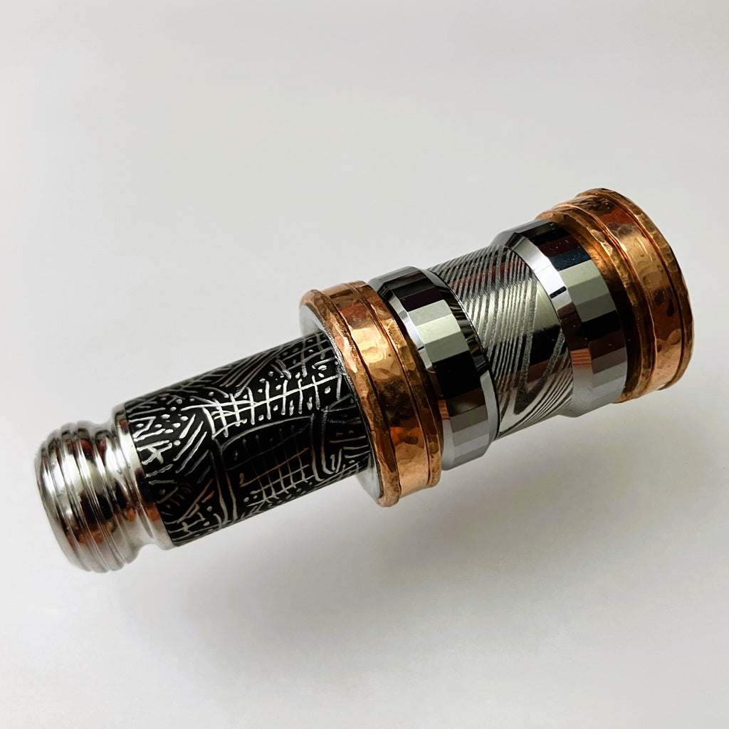 This is the first GEN 3.91 Thinket Hybrid (w/ Faceted Tungsten, SS-Damascus Copper, & Copper-Plated Steel Proto-Style Handle assembly, w/ Hand-engraved & signed Black DLC-coated Slider-Tube & Rhodium-plated Slider-Heads (The Handle-Core comprises #316 SS).