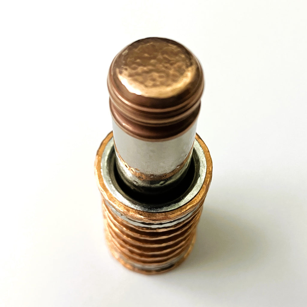 This GEN 3.91 Proto-Style Thinket (w/ Stainless-Steel & Copper Ring-Slices, Nickel-plated Steel Attractor Rings, and flared Stainless-Steel Sleeve for the Handle; w/ hammer-textured Nickel-plated Brass Slider-Tube and Copper-plated Slider-Heads).